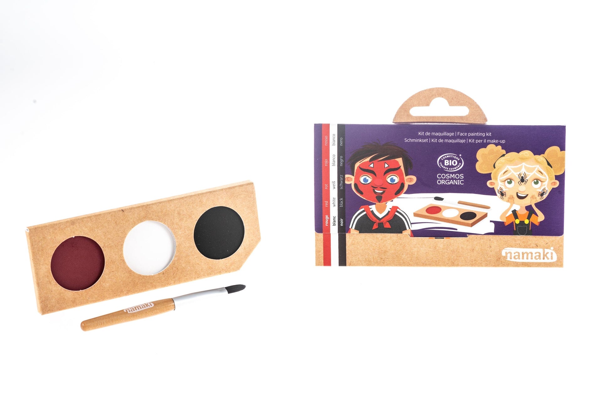 Maquille toi en diable ou en araignée avec ce maquillage à base d'eau, certifié bio et hypoallergénique comprenant une palette de maquillage 3 couleurs (rouge, blanc, noir), 2 modèles de maquillage et un pinceau cosmétique. Jusqu'à dix maquillages peuvent être réalisés avec un seul kit : de quoi s'amuser pendant des heures !