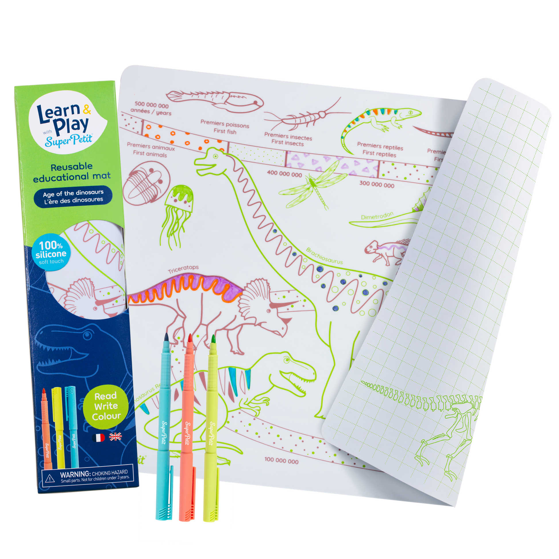 L’ÈRE DES DINOSAURES :1 set en silicone réversible: 1 côté coloriage pédagogique + 1 côté dessin libre + 1 feutre inclus