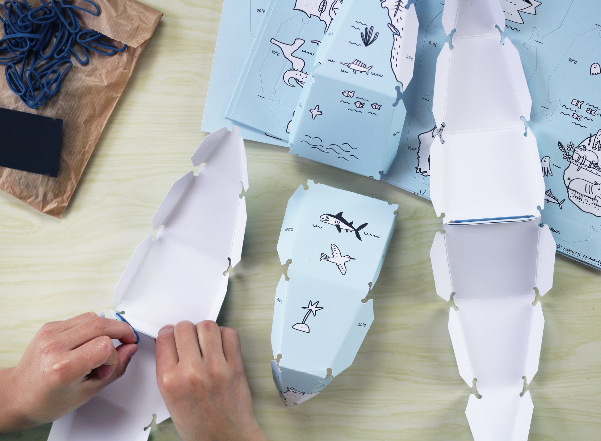 "Découvrez une activité artistique sans nécessité de colle ou de ciseaux. Les fuseaux de papier s'emboîtent astucieusement à l'aide d'élastiques grâce au système révolutionnaire Elastiblock®. En un clin d'œil, le globe terrestre se dessine devant vous ! Il ne vous reste plus qu'à mettre en couleur les divers animaux, oiseaux, poissons, fleurs et arbres. Embarquez pour un voyage captivant autour du monde !"