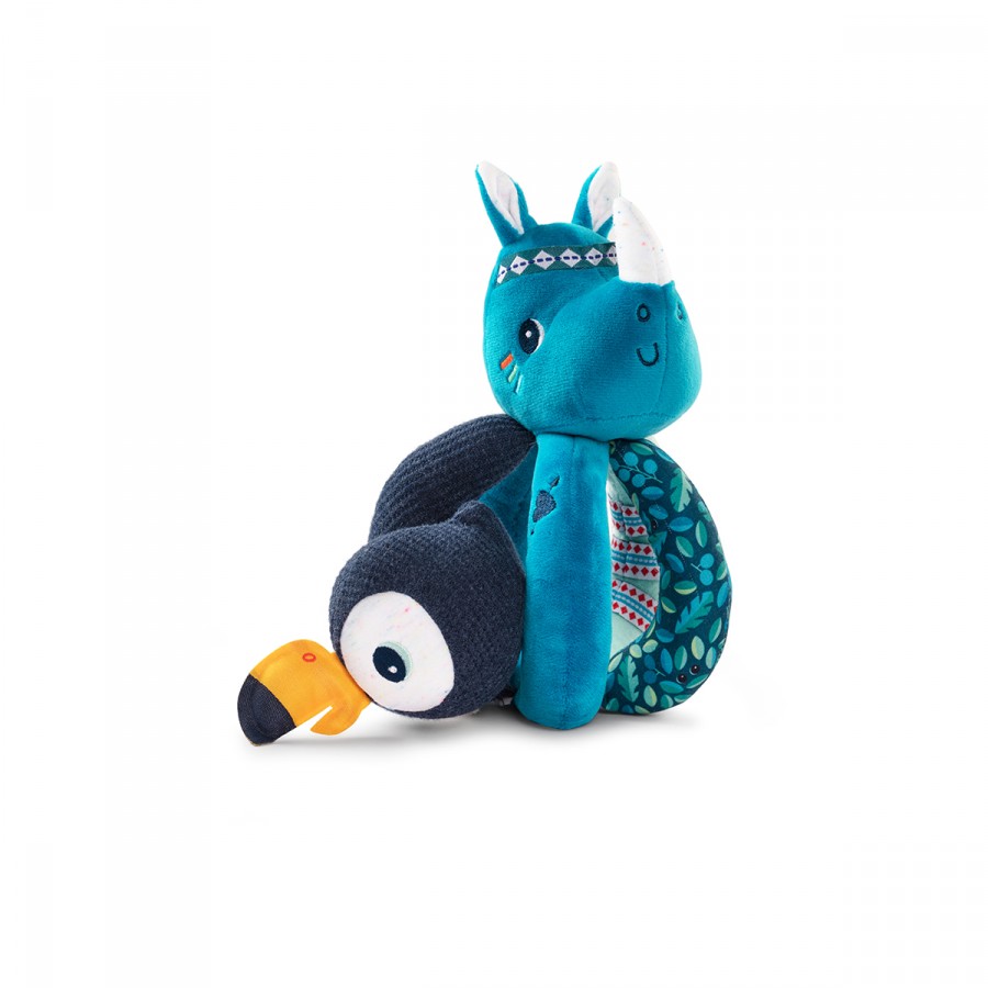 Un hochet original, que les petites mains saisissent facilement. Un petit ami se cache entre les poignées.