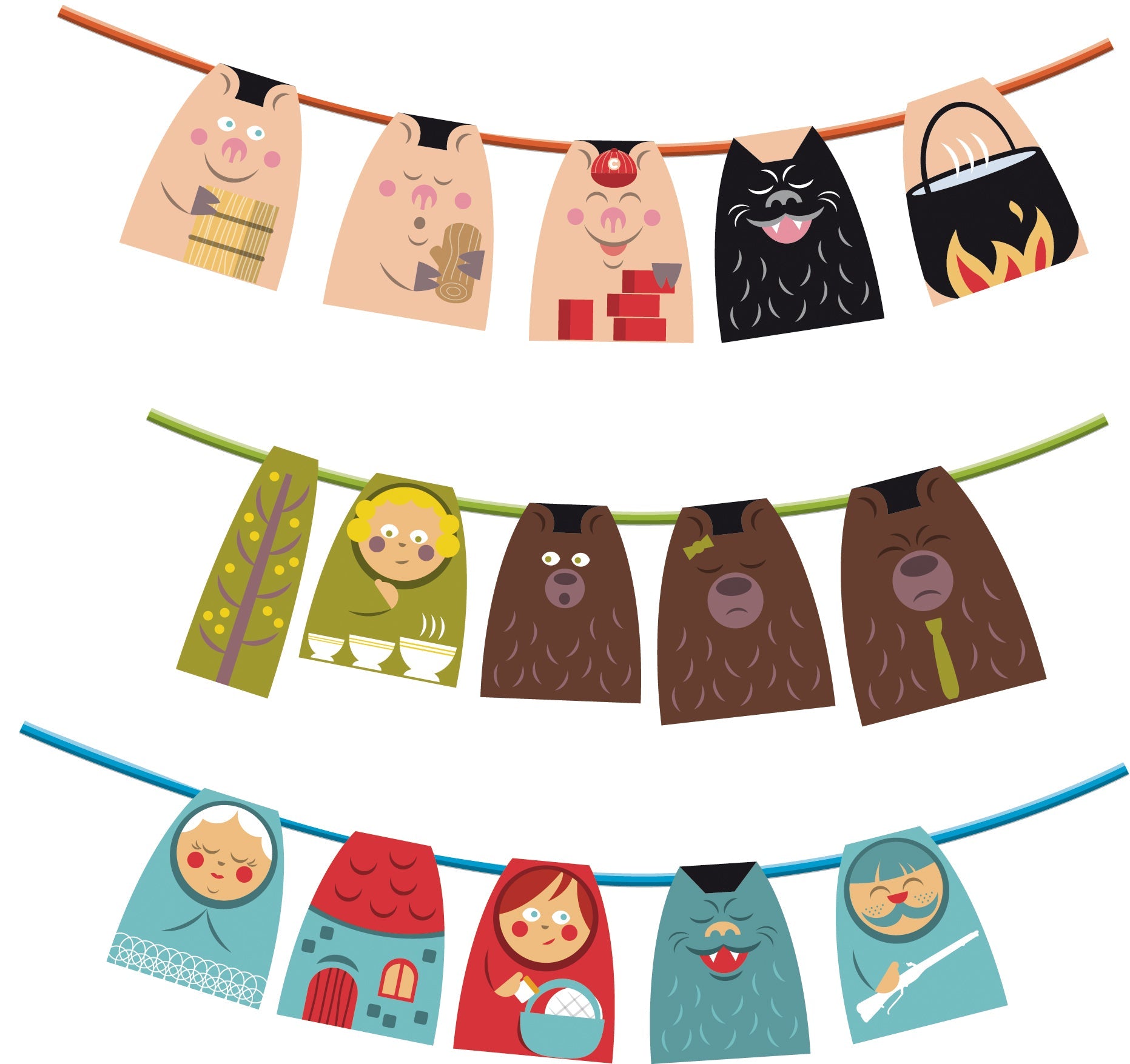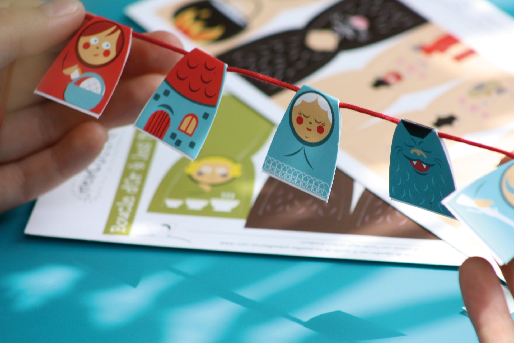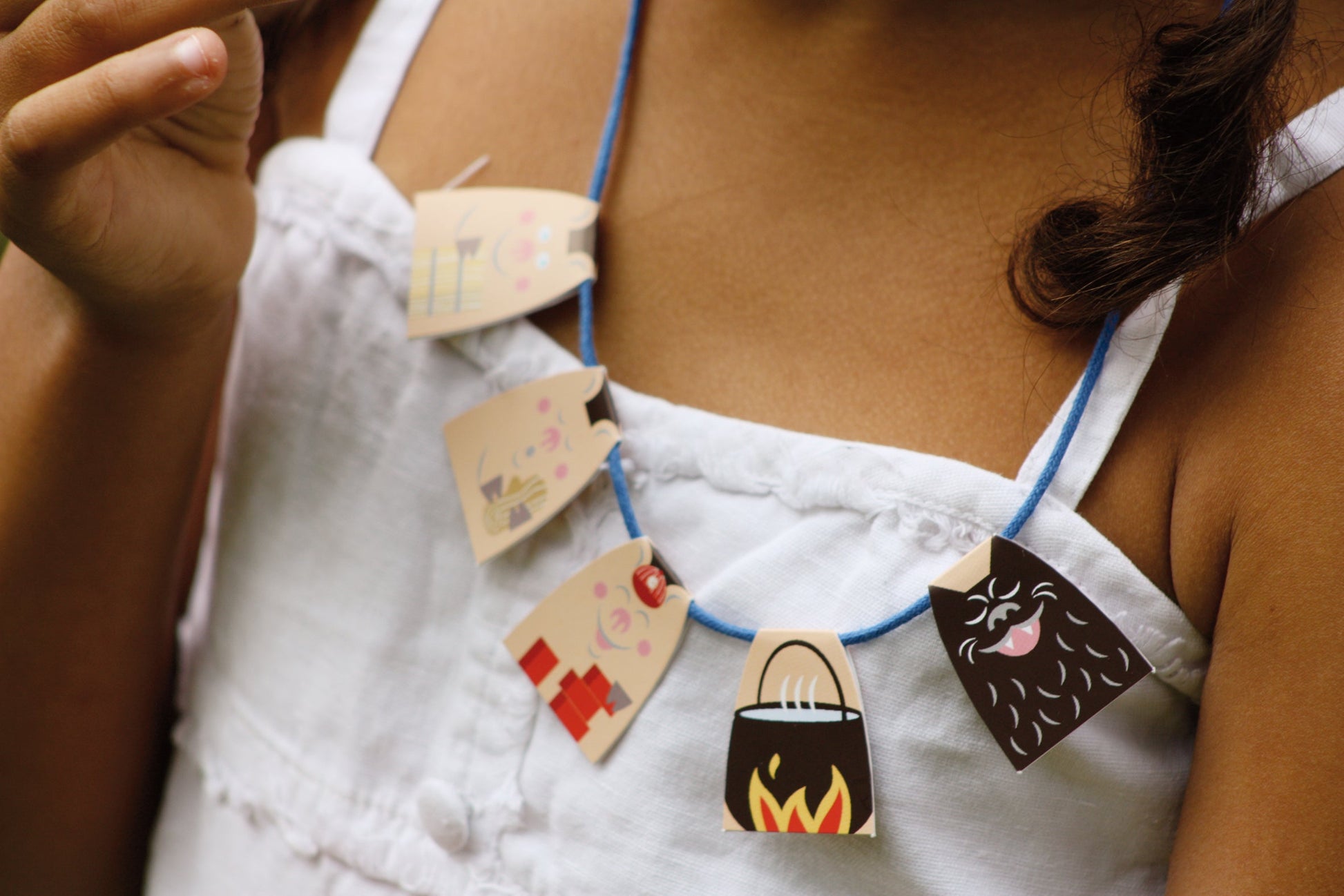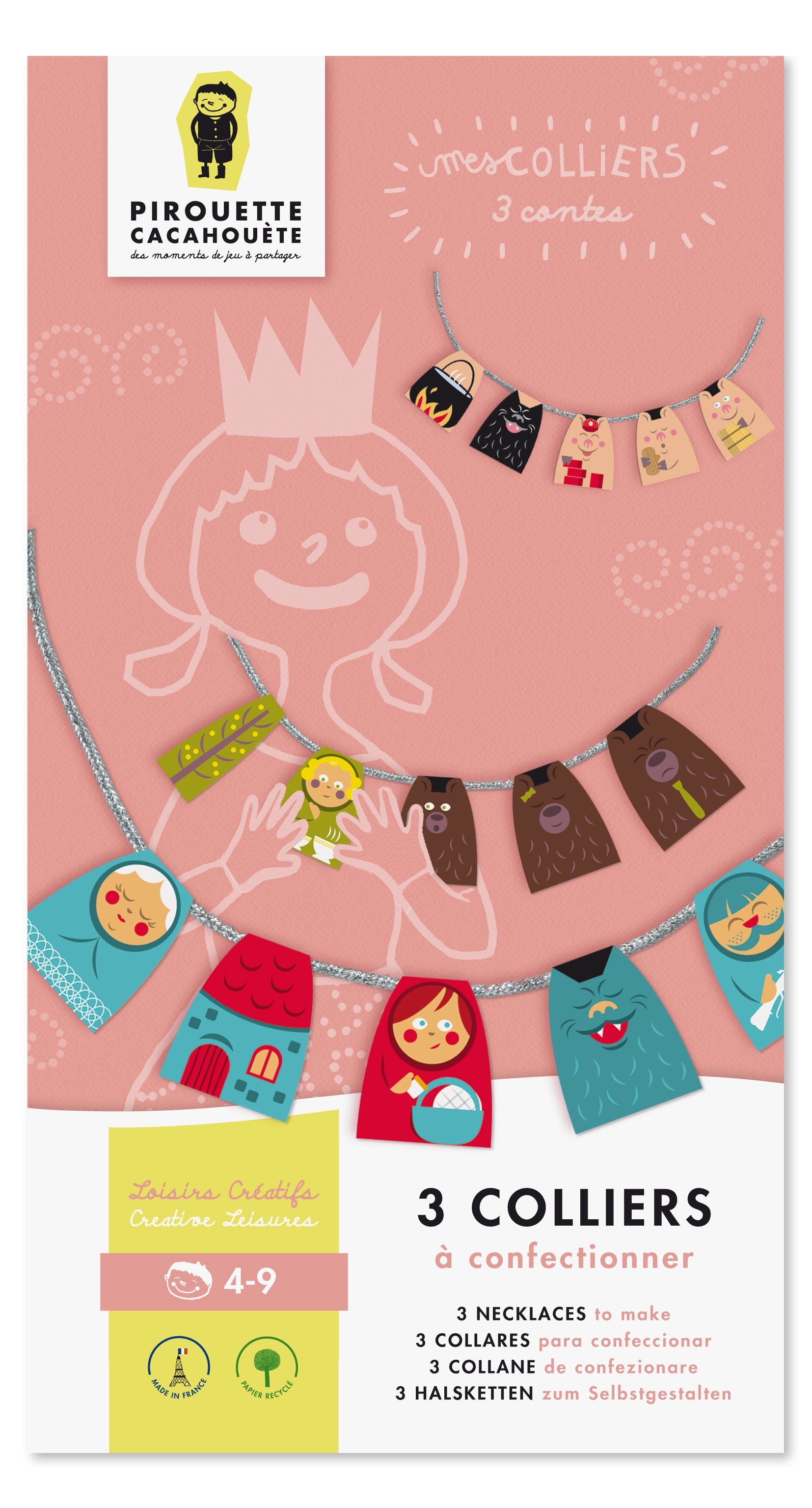 "Des merveilles en papier cartonné débordant de créativité ! Plongez dans un atelier féerique où chaque collier orné d'un fil argenté évoque un conte classique : Le Petit Chaperon Rouge, Les Trois Petits Cochons, et Boucle d'Or et les Trois Ours. Astuce : Pour une attache solide, suivez les instructions de nouage fournies dans la notice."