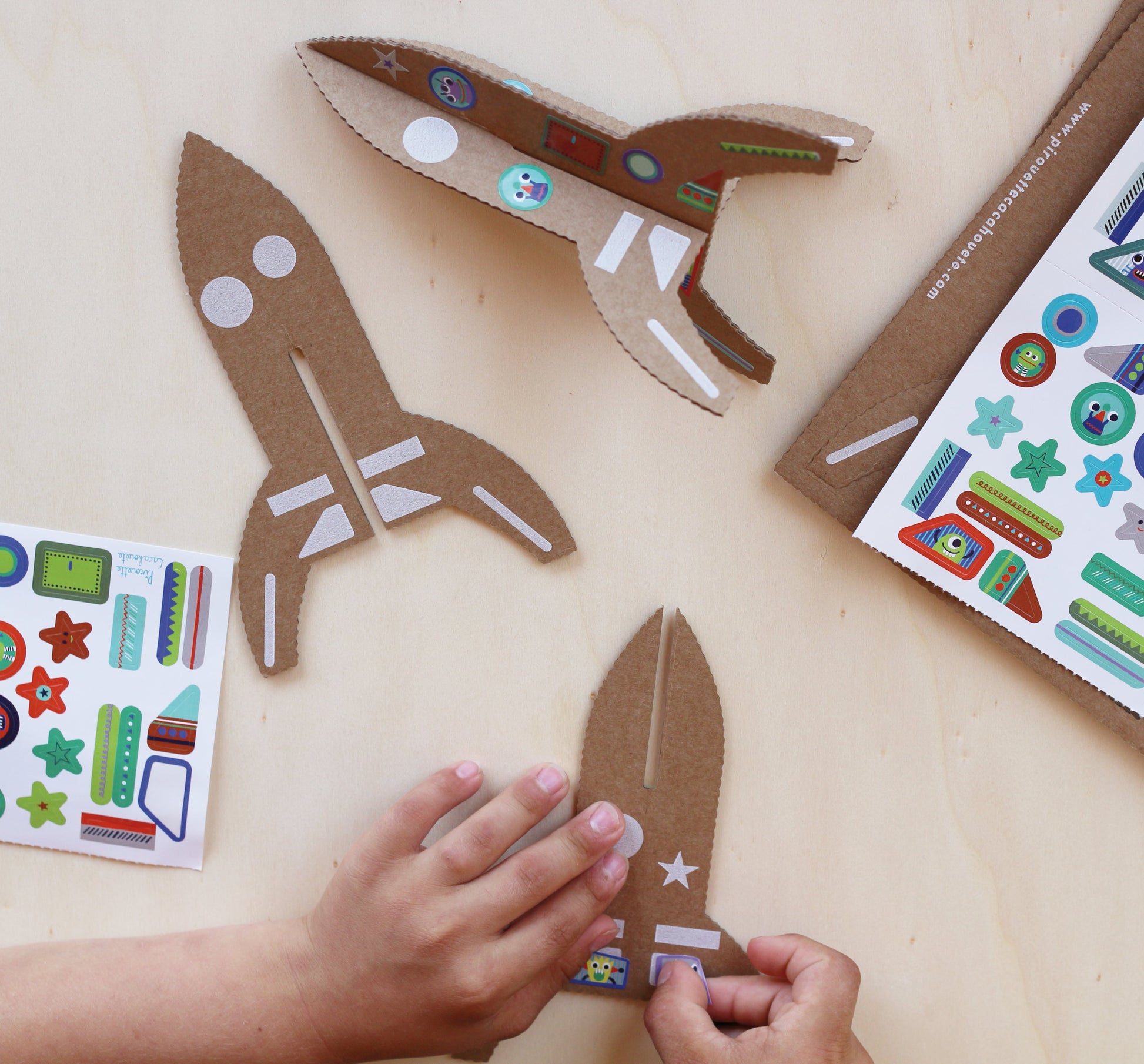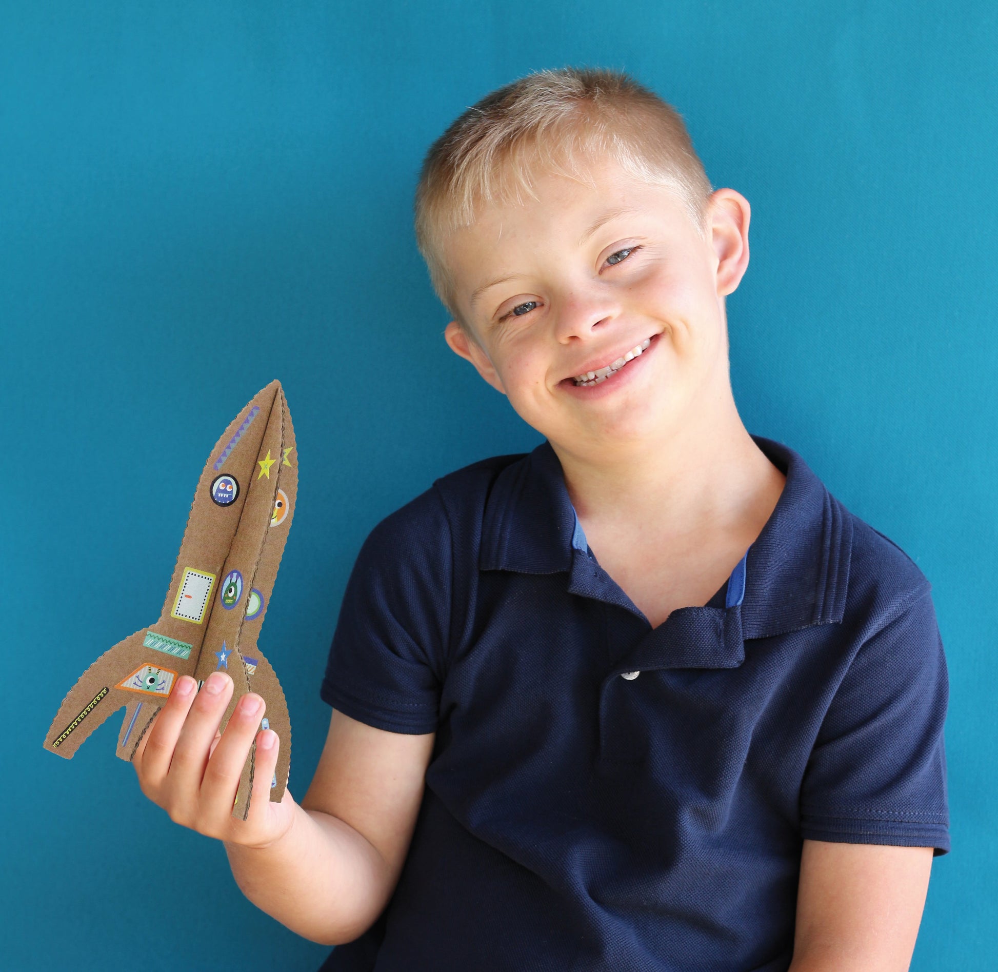 "Découvrez une activité artistique sans besoin de colle ou de ciseaux. Assemblez simplement quelques pièces de carton et vos fusées sont sur le point de s'envoler. Remplissez les avec une joyeuse bande de petits extraterrestres, qu'ils soient verts, bleus ou roses, chacun plus amusant que le précédent ! Certains hublots vierges sont prêts à être personnalisés avec un simple crayon ou feutre. Préparez vous pour une aventure intergalactique !"