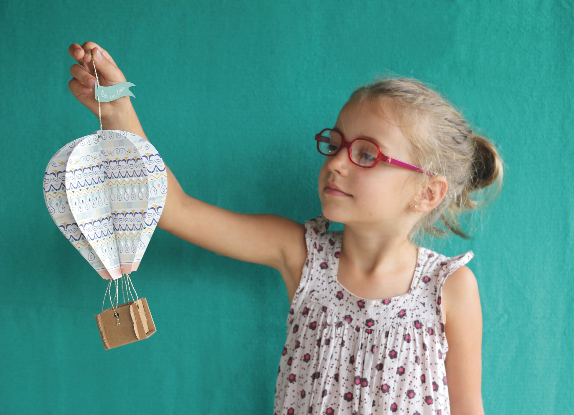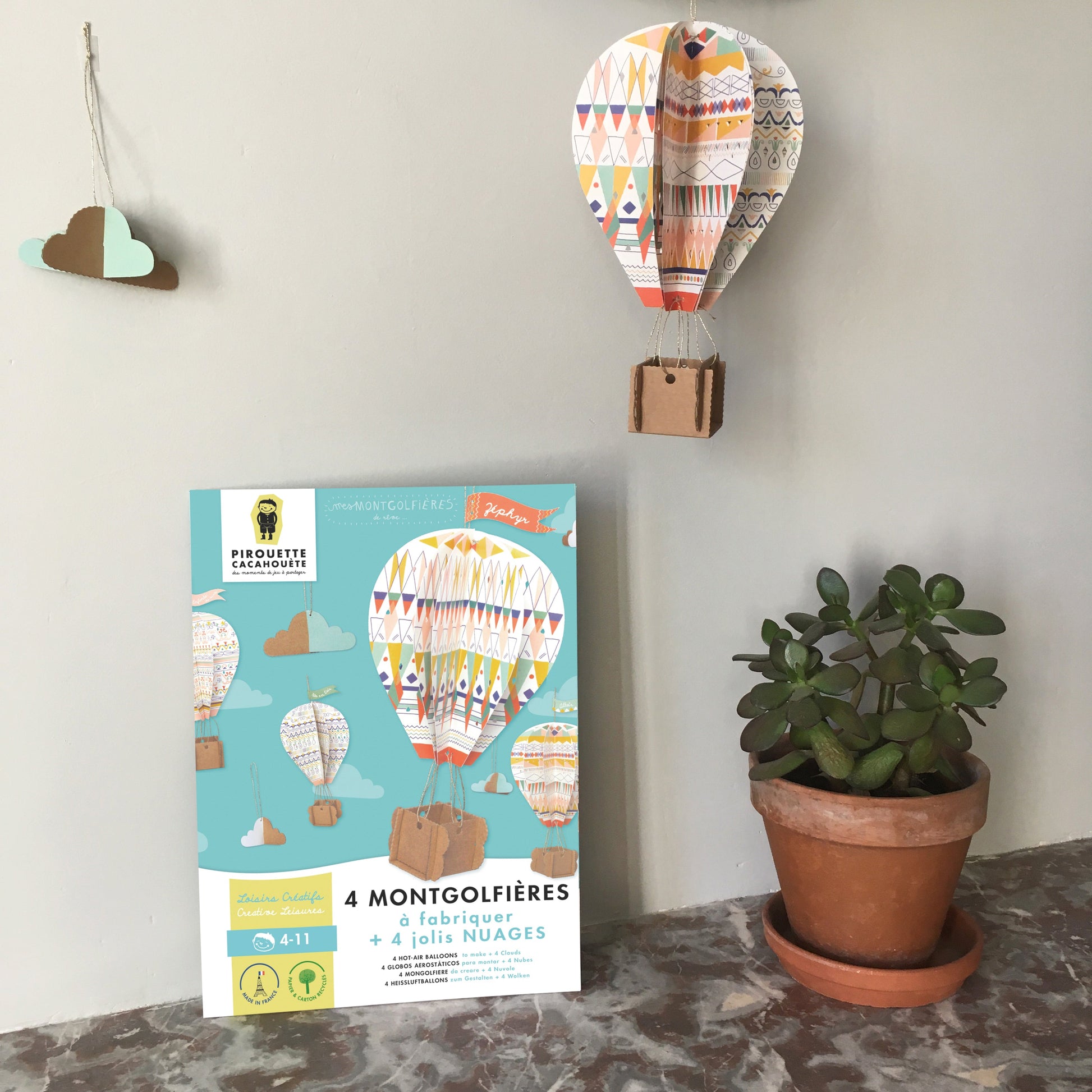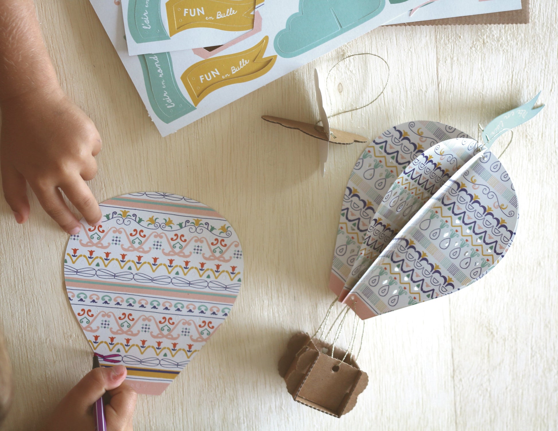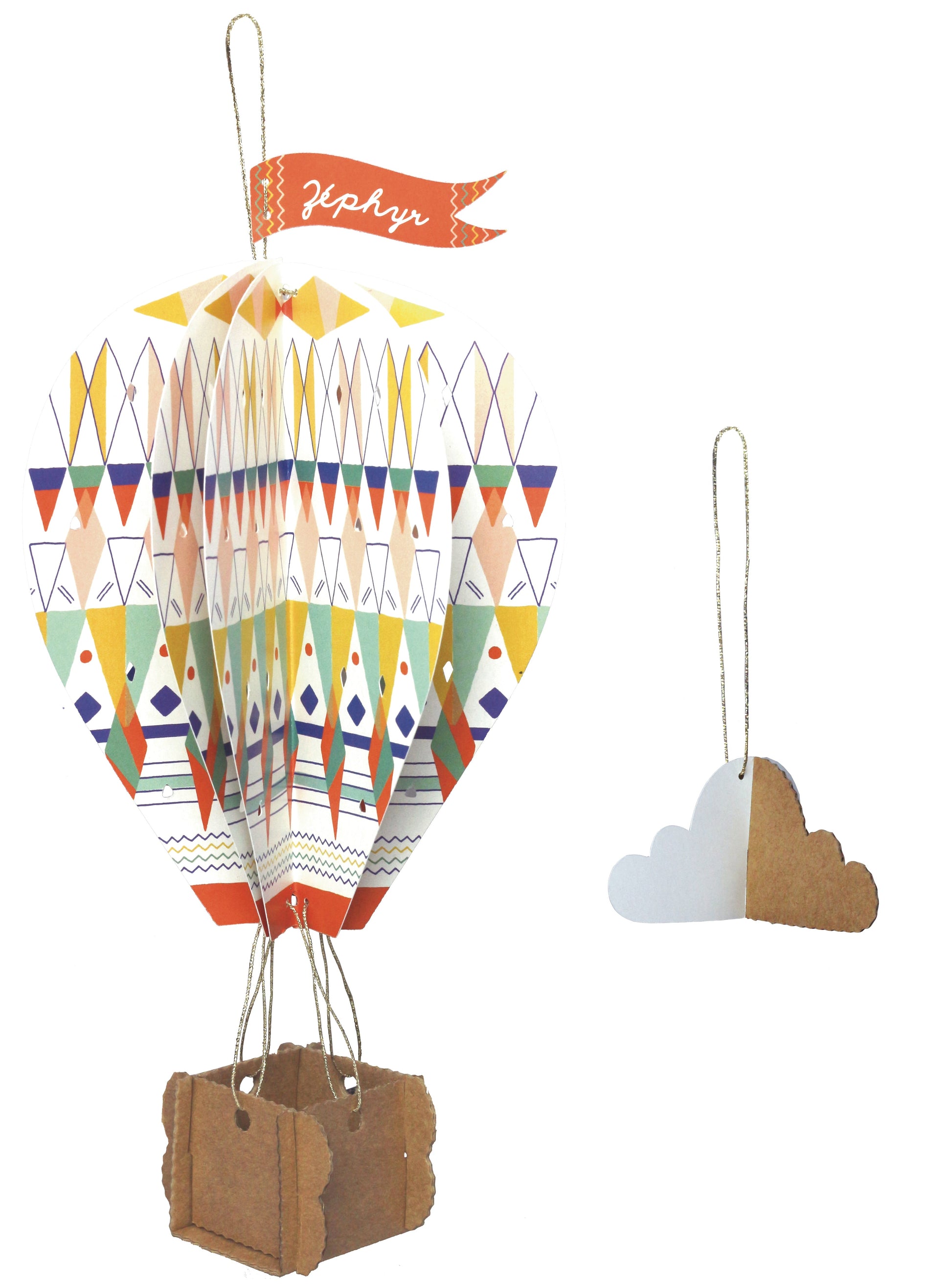 "Embarquez les enfants dans une aventure au cœur de leur imagination... Le fil doré relie harmonieusement les quatre éléments perforés en papier du ballon et les deux parties en carton du panier. La montgolfière s'épanouit, prête à être accrochée. De plus, carton et papier se combinent pour créer un nuage charmant à suspendre. Mettez le cap sur le monde merveilleux des songes !"