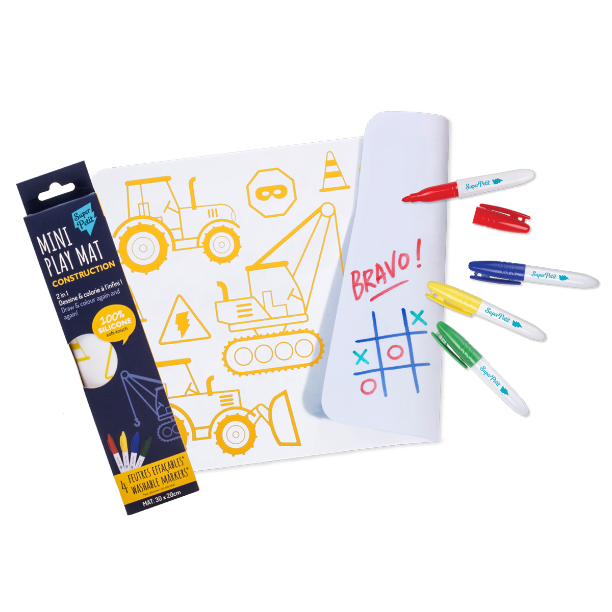 Mini Playmat réversible : 1 set reversible: 1 côté coloriage + 1 côté dessin libre + 4 feutres inclus