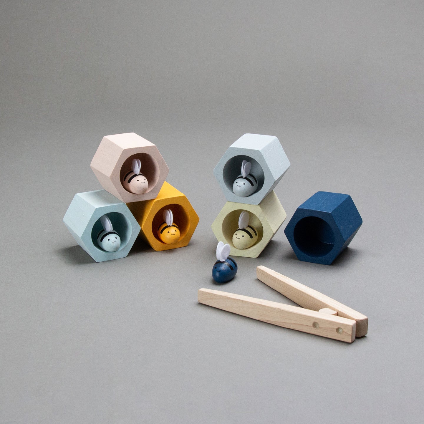 Ce jeu Plan Toys comprend 1 grande pince en bois, 6 abeilles et 6 alvéoles en bois aux couleurs vives. Le but du jeu est de replacer chaque abeille dans son alvéole de même couleur. Ce jeu développe la motricité digitale des enfants en leur permettant de saisir avec 2 ou 3 doigts seulement un petit objet. Il les aide à se concentrer et à aiguiser et leur sens de l'observation. A partir de 3 ans.