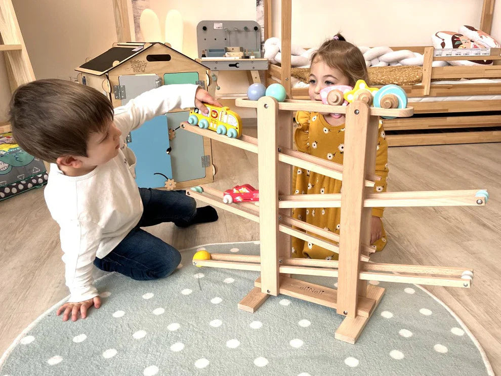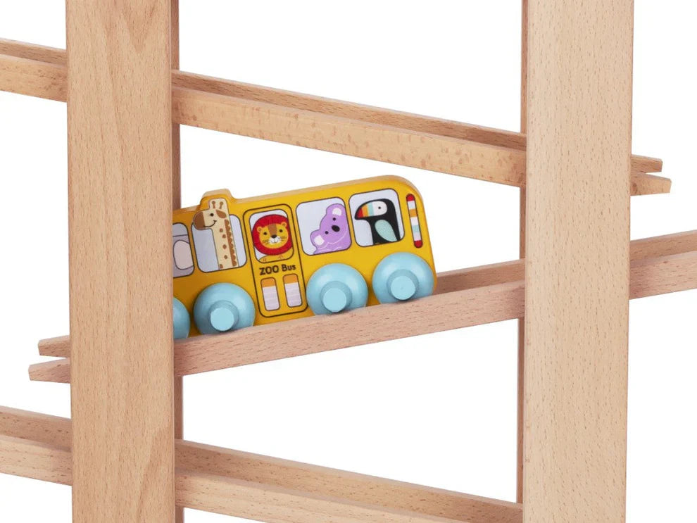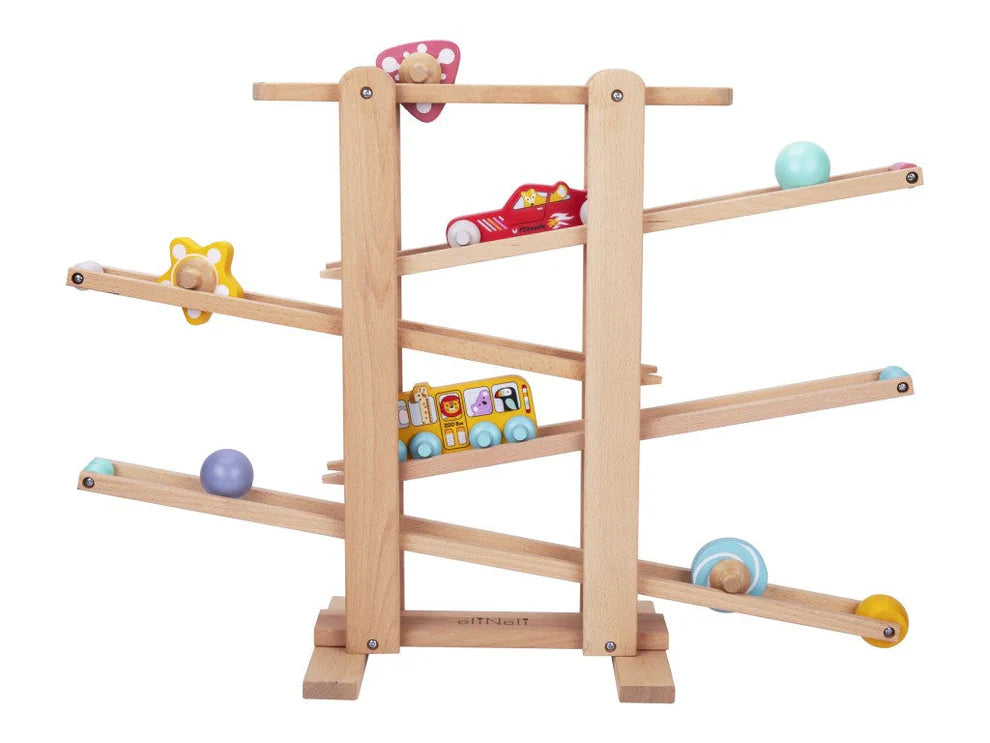 Le circuit de boules en bois avec des éléments originaux, une voiture et un bus avec des animaux ravira tout le monde. Découvrez le circuit de boules avec un ensemble de petites voitures gratuites.