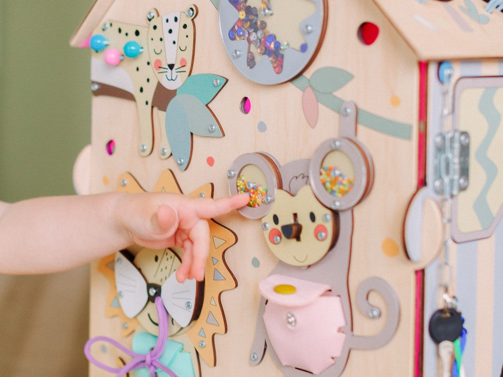 La maison à panneaux d'activités lumineux aux couleurs pastel emmène les enfants au zoo. Découvrez les éléments ludiques et Montessori sur le tableau d'activités avec éclairage LED.