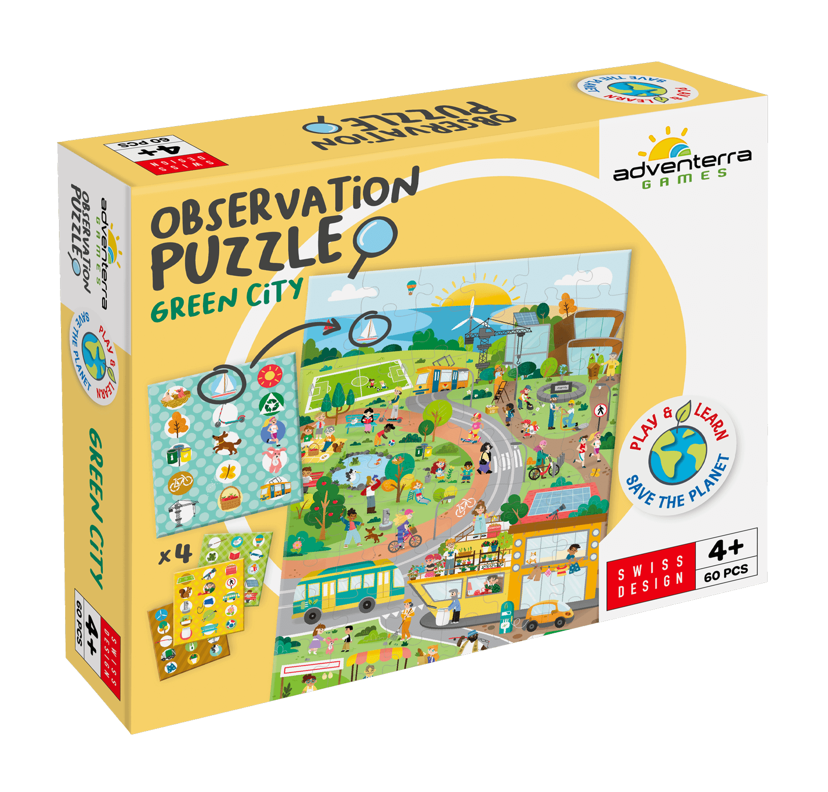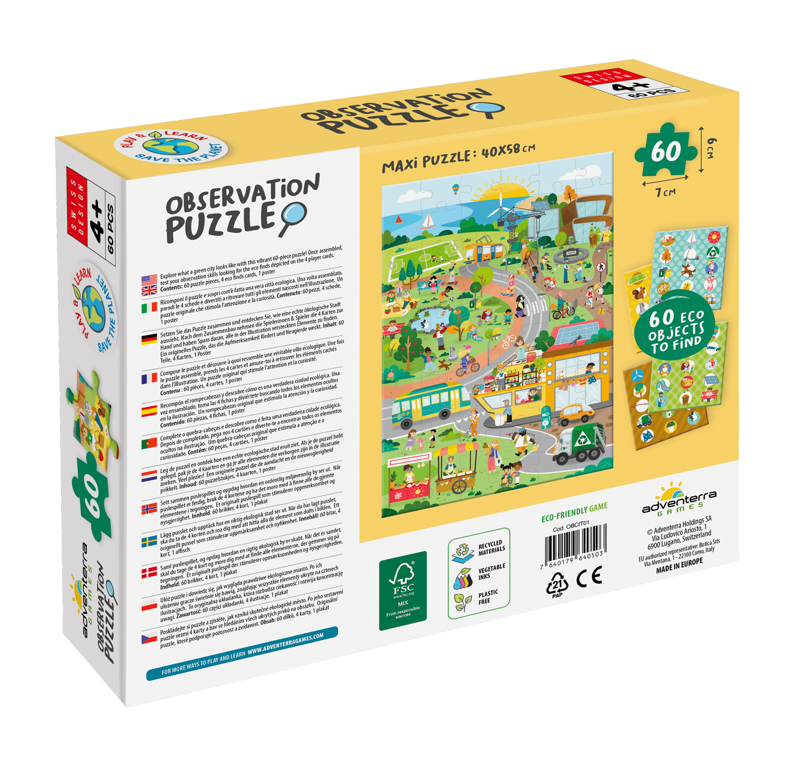 Ce puzzle fantastique de 60 pièces invite les plus petits à découvrir à quoi ressemble une véritable ville écologique ! Une fois assemblés, les enfants testent leur sens de l'observation en recherchant les éléments écologiques illustrés sur les 4 fiches cartonnées, À travers ce jeu, ils découvrent les objets, comportements et activités qui rendent une ville plus respectueuse de l’environnement, Un poster en taille réelle, en plus des pièces du puzzle, se cache à l'intérieur de la boîte,